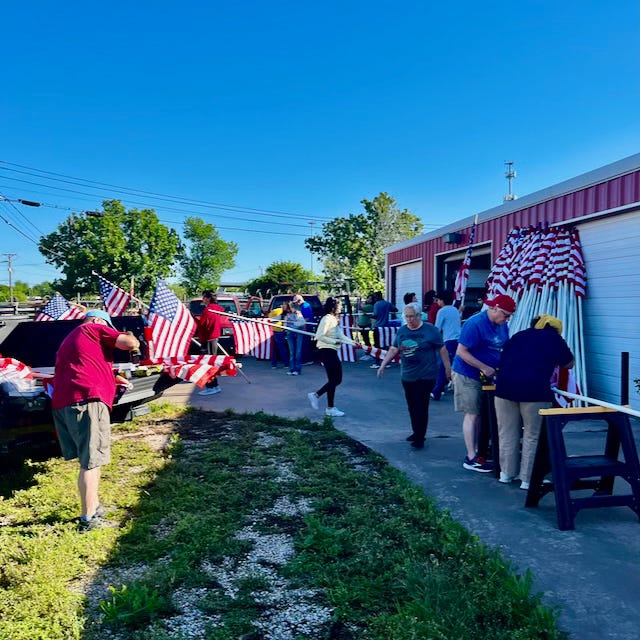 On May 3, 30 people joined in preparing 800 US flags for display at area homes, businesses, and schools.